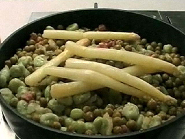 Рецепт тушеных бобов со спаржей.Состав:артишоки, спаржа, горошек, ветчина, бобы, лук, чеснок, мука, масло, соль.