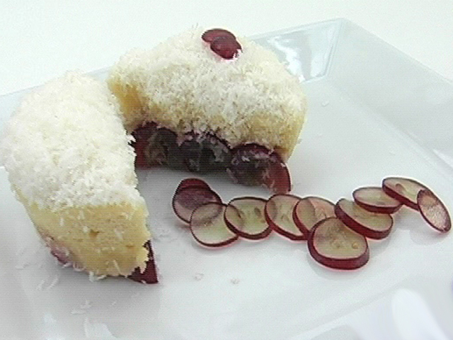 Сладкое завершение обеда с пареным кокосом с виноградом и шоколадом.Состав:кокос — 50 гр;молоко — 100 гр;яйцо — 1 штука;сахар — 15 гр;мука — 30 гр;масло — 10 гр;кипяток — 1 столовая ложка;пальмовый сахар — 15 гр;немного шоколадного соуса, красного винограда.